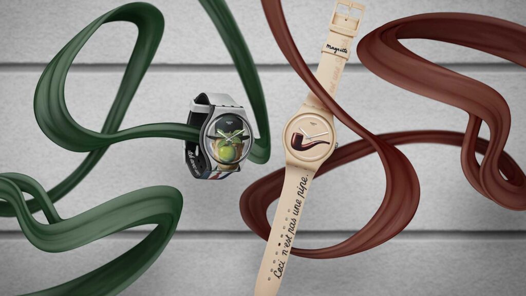 La Trahison des Images di Renè Magritte, opera surreale di Magritte, è riprodotta nei dettagli sul quadrante dell’orologio. Un modello dai toni caldi e avvolgenti con lancette color argento, che brillano di personalità. Sul cinturino sono stampati giochi di parole provocatori: “Ceci n’est pas une pipe. Ceci est une Swatch.“