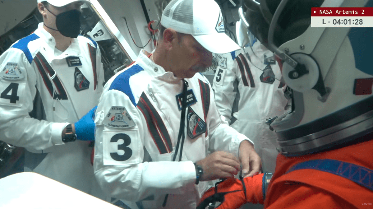 Gli astronauti sono fatti accomodare singolarmente nella capsula di lancio di Artemis II.