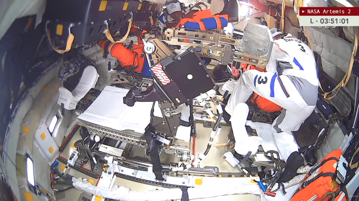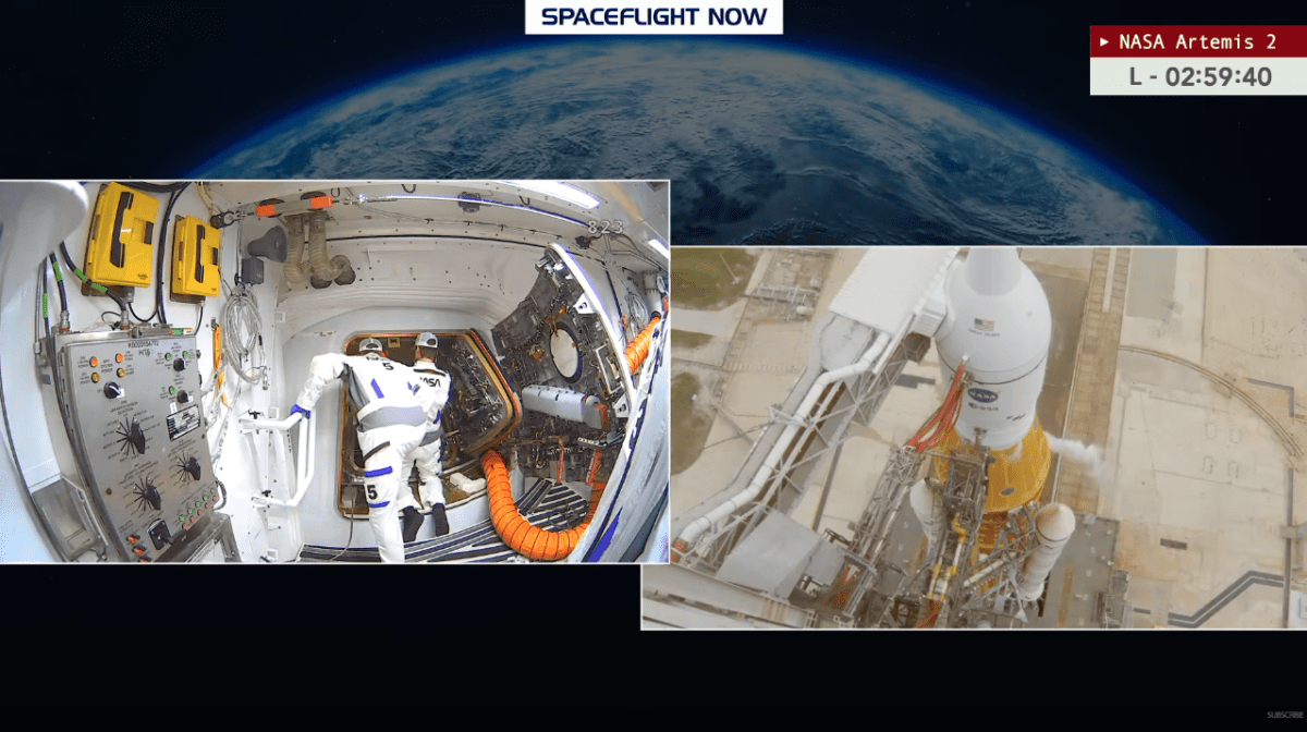 Continuano le operazioni nella white room per sigillare ermeticamente il portellone della Orion. La White Room è la camera sterile bianca collegata al braccio di accesso sulla rampa LC-39B: qui i quattro astronauti hanno fatto gli ultimi check, indossando tute MACES prima di entrare in Orion – un ambiente climatizzato a 22°C con filtri HEPA per zero contaminazioni.