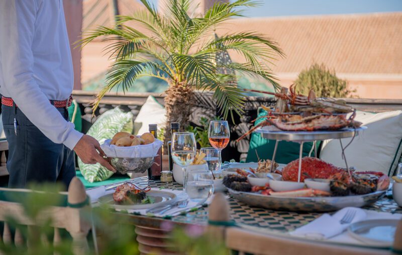 Gli ambienti raffinati, decorati da intricati mosaici e opere d’arte di scene del deserto, si possono ammirare in tutte le aree oltre che nelle affascinanti terrazze sul tetto che si affacciano sulla città rossa e sulle tombe Saadiane..