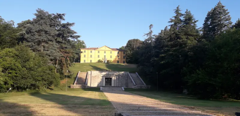 Una bella villa arrampicata su di un colle ventoso, circondata da pini, lecci e altri alberi fronzuti, immersa nel verde delle colline emiliane, ornata da fiori e prati verdi, oltre che da statue e opere scultoree.