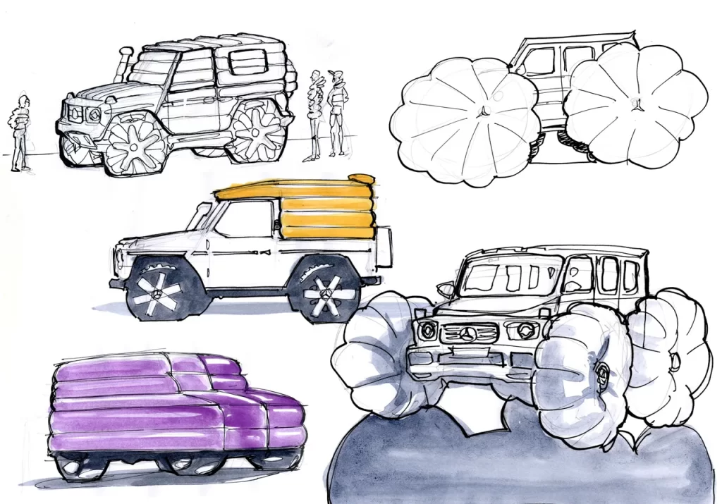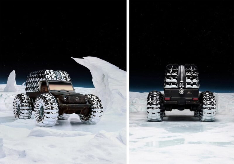 Il progetto artistico è la sintesi dei due prodotti più iconici per Moncler e per Mercedes. Il rivestimento tutt’attorno alla Mercedes classe G è infatti ispirato alla giacca Puffer, una delle linee piumino Moncler più famose.
