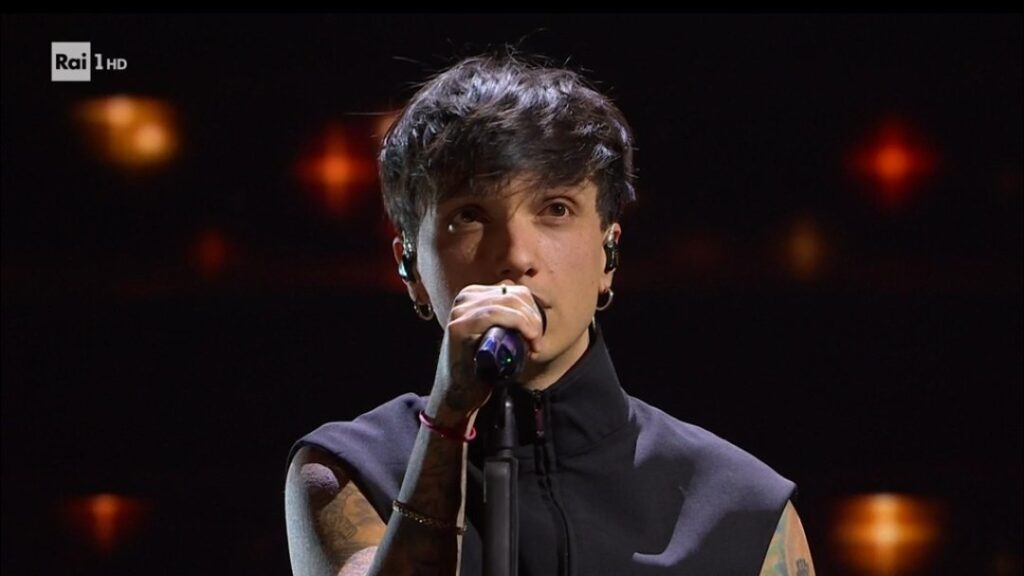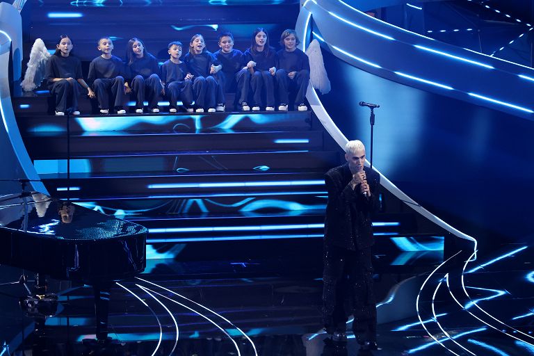 VOTO 7: Con ”Supereori”, che strappa anche alcune lacrime, sale sul palco Mr. Rain accompagnato da alcuni bambini. Mr. Rain sceglie un look scintillante di GCDS.
