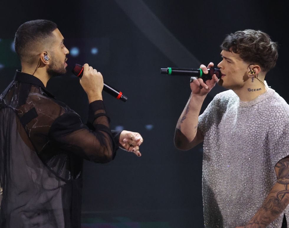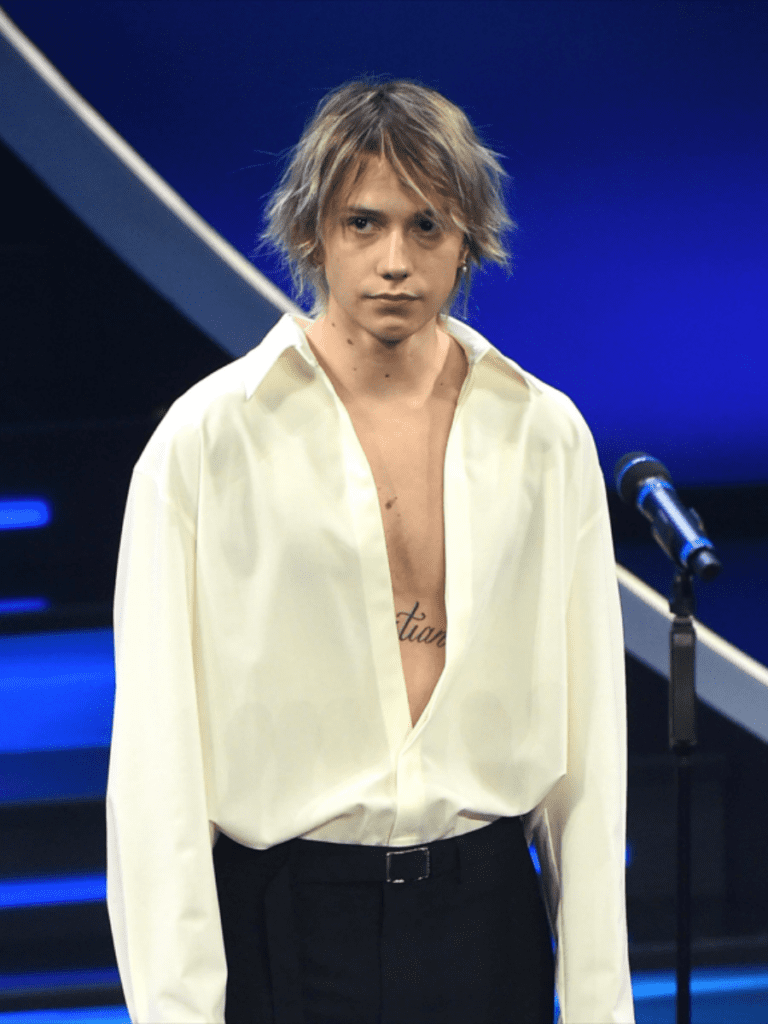 VOTO 8: Tra gli ospiti maschili di questa prima serata tornano dopo il titolo conquistato con ”Brividi” a Sanremo 2022 Mahmood e Blanco per una ventata di stile. Blanco sceglie una blusa ricoperta di cristalli con pantaloni oversize, di Dolce&Gabbana, Mahmood sceglie Rick Owens per lui giacca nude e con maxi zeppe