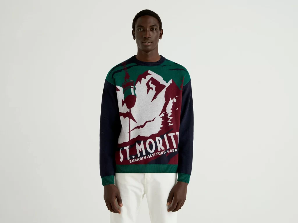 Fondo rosso, blu o verde, per un trio di modelli firmati United Colors of Benetton. Realizzati in misto cashmere, con grafiche sul davanti ispirate alle più celebri località sciistiche e ai loro fantastci paesaggi invernali.