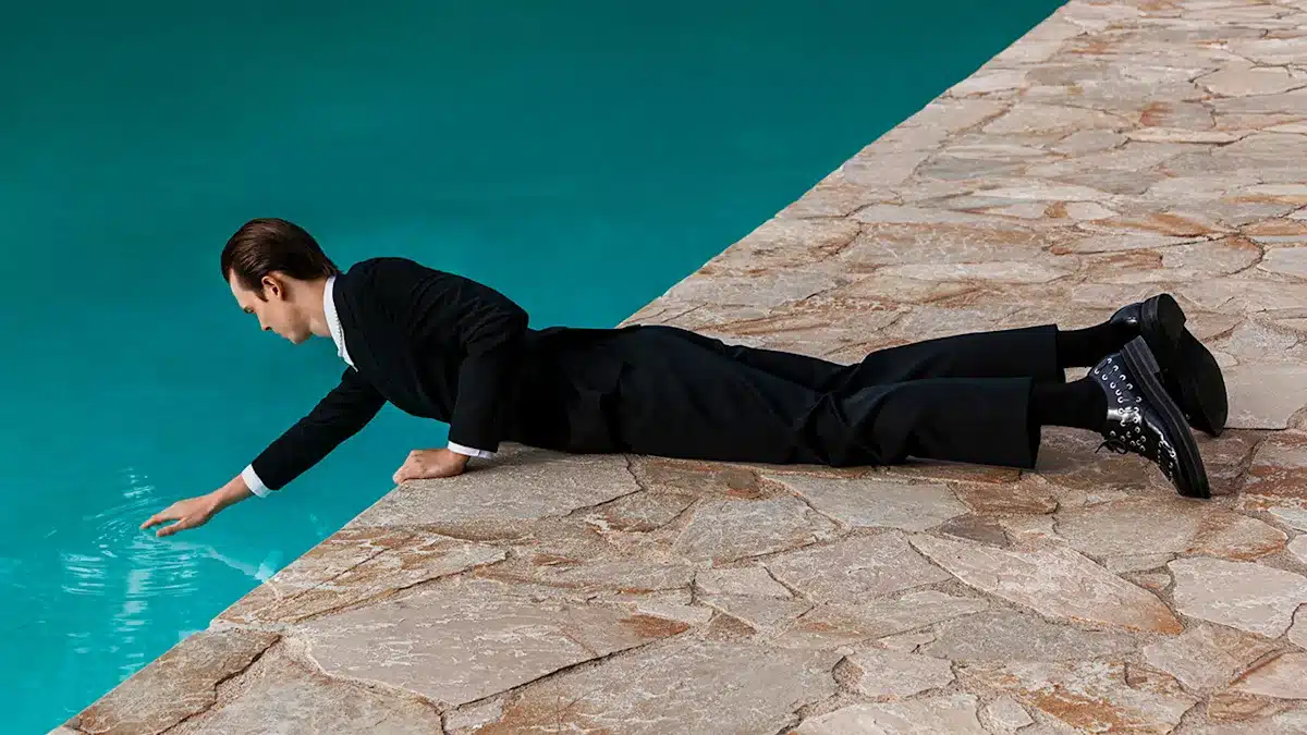 The Pool non offre risposte semplici né concilia i contrasti che mette in scena. Lascia aperte le domande — su cosa significhi oggi vestirsi da uomo, su dove si trovi il confine tra seduzione e consapevolezza di sé, tra conformità e rottura. Ed è proprio questa ambiguità a renderlo un tema perfetto per aprire la conversazione su ciò che il menswear sarà nella prossima stagione.