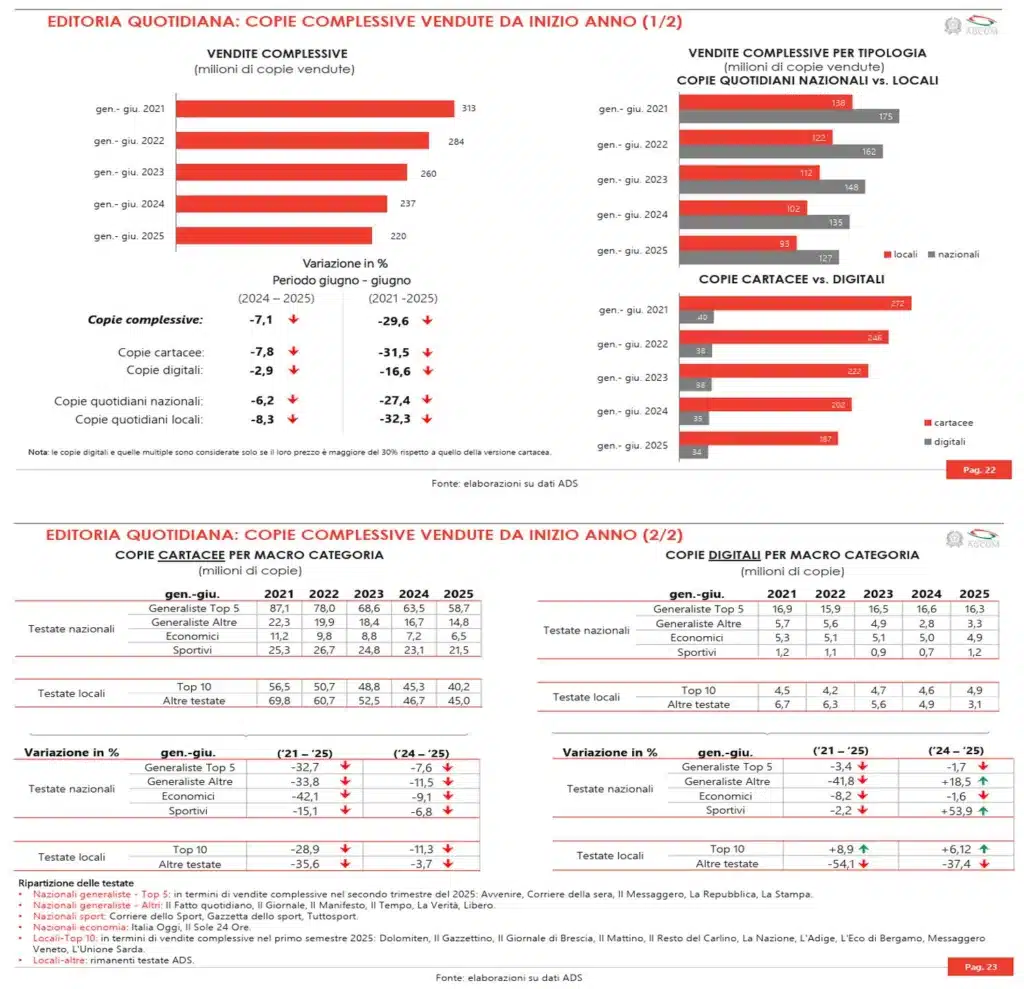 L’Osservatorio AGCOM n.3/2025 ha confermato un passaggio storico: i quotidiani cartacei e le copie digitali registrano un’ulteriore riduzione; il pubblico si sposta sempre più verso contenuti più veloci, più accessibili e maggiormente integrati nella routine digitale.