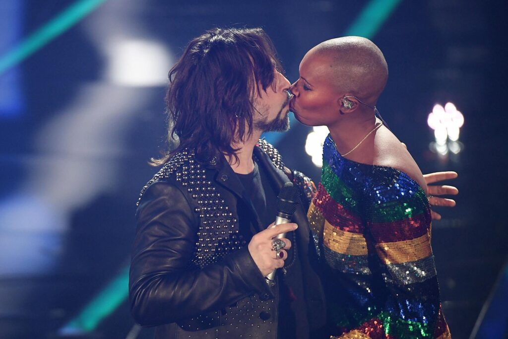 Alla 68esima edizione del Festival, anno 2018, tra Skin e il frontman delle Vibrazioni, Francesco Sarcina scatta il bacio.