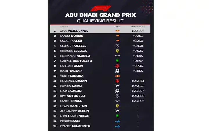 Verstappen parte dalla pole e punta alla vittoria per portare la lotta al limite. Norris scatta al suo fianco, pronto a controllare la situazione. Piastri parte dalla seconda fila e resta il terzo elemento della corsa al titolo, pronto a sfruttare ogni errore dei due rivali.