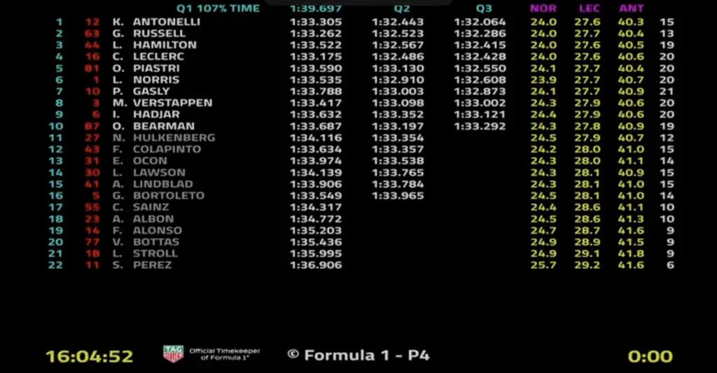Eliminati in Q2: Bortoleto, Lindblad, Lawson, Ocon, Colapinto, Hulkenberg.